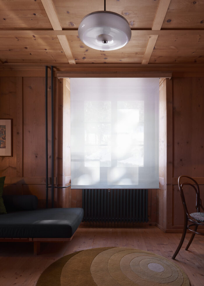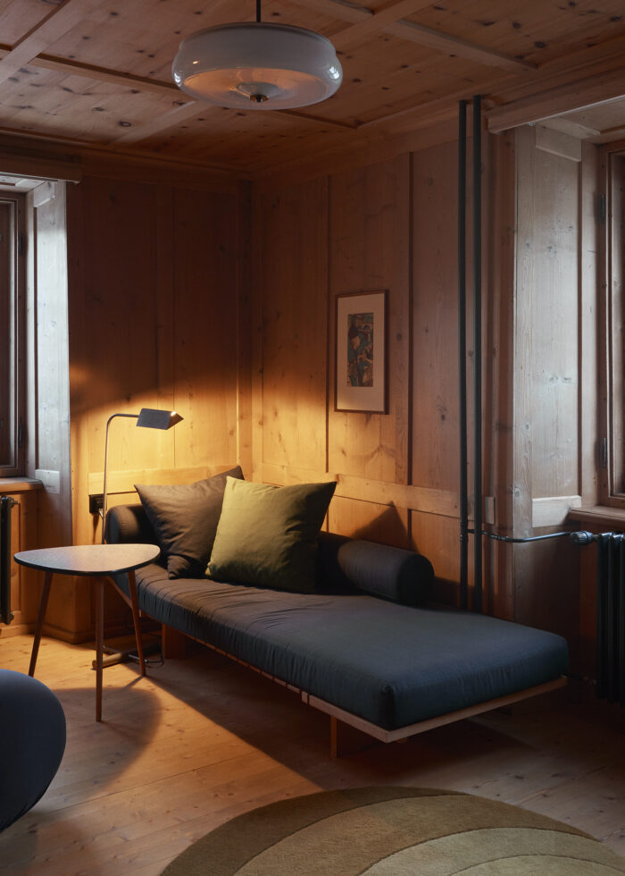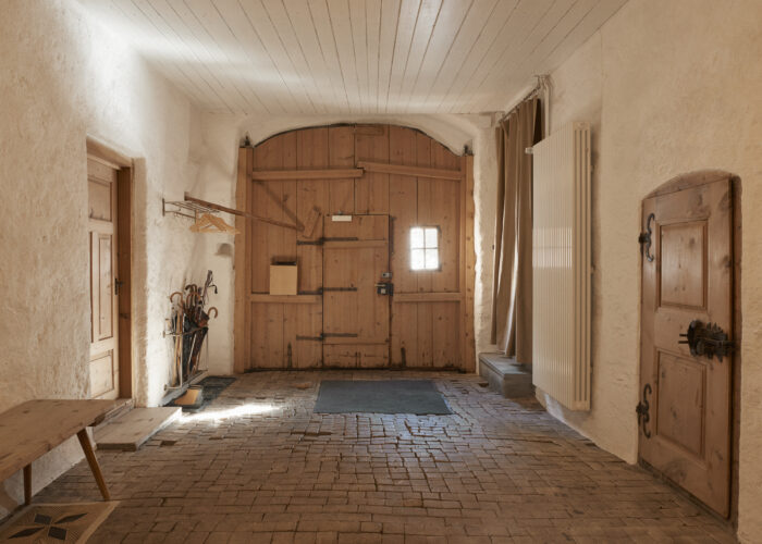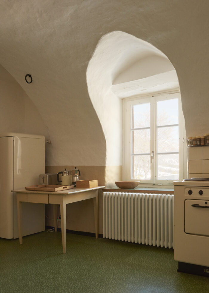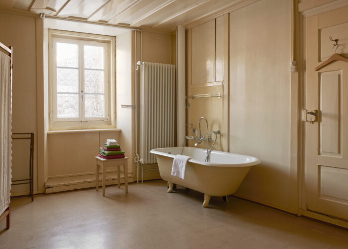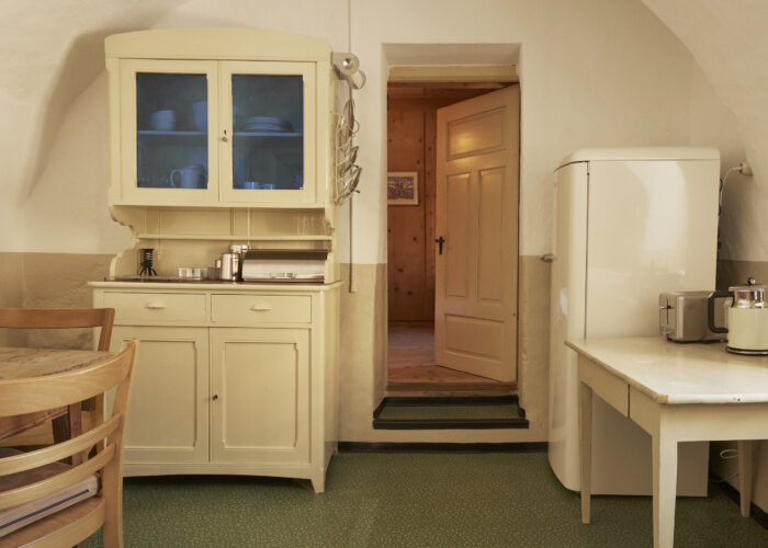 Die Wohnung im Parterre hat ein Stübchen, ein Schlafzimmer mit Doppelbett, ein grosses offenes Bad mit Sitzwanne (keine Stehdusche!) und eine im schönsten Sinn nostalgische Gewölbeküche. Dazu kommt ein kleiner Balkon mit direktem Zugang ins Grüne. Sie eignet sich für ein zurückgezogenes Paar und/oder Eltern mit einem Kind. Für mehr Personen kann sie um ein zweites Schlafzimmer mit eigenem Bad (Atelier 1) vergrössert werden, das sich auf der anderen Seite des Flurs befindet.